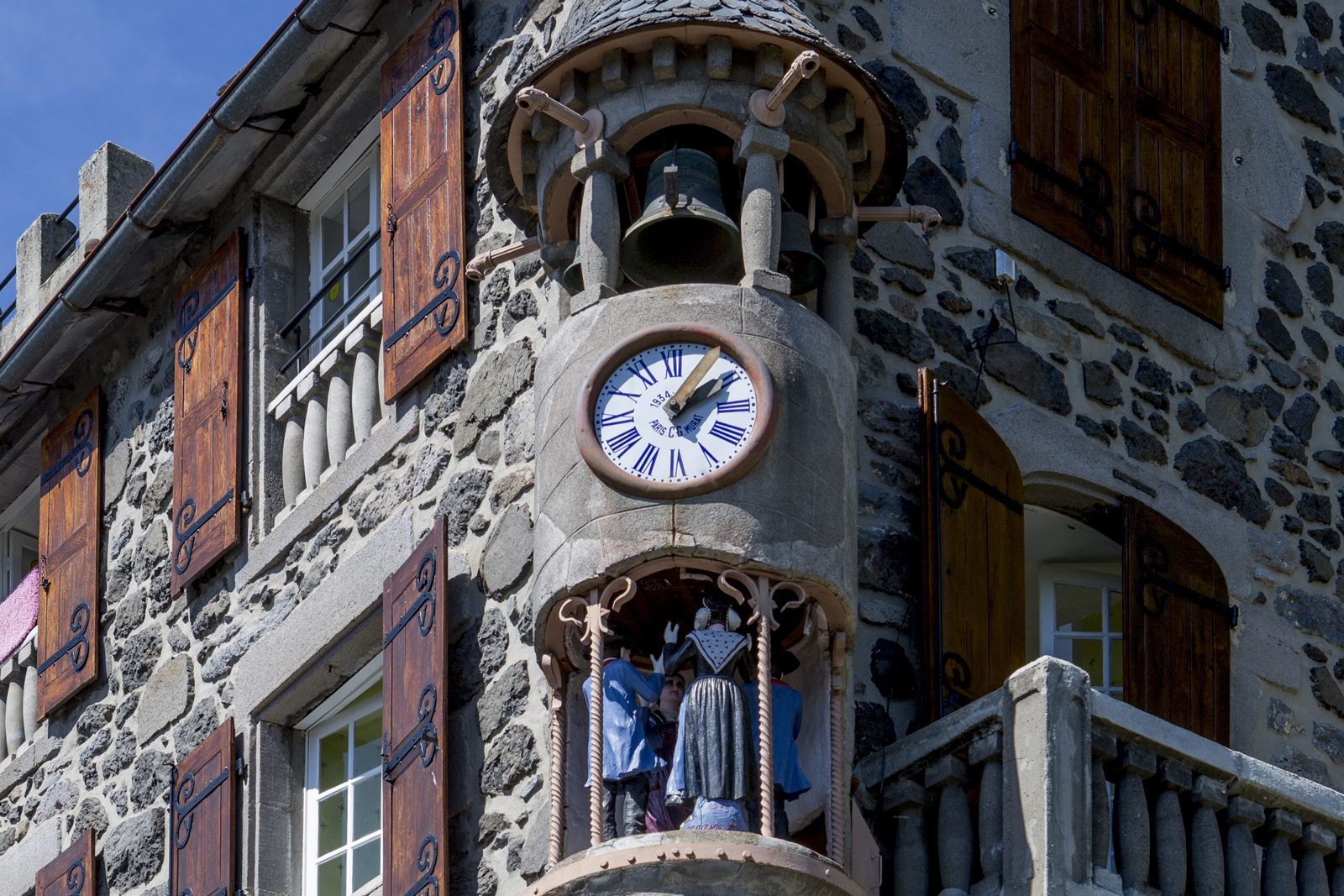 En 1938, Charles Gaudron, chirurgien-dentiste passionné d’horlogerie, a fait réaliser ce jacquemart pour immortaliser ses enfants, en costume traditionnel auvergnat, dansant la Bourrée. Les quatre personnages en bois peint tournent sur un socle de bois. Au-dessus d’eux, on retrouve l’horloge puis les cloches. Le jacquemart a ici la forme d’une tourelle d’angle, sur son toit un coq sonne les 12 coups de midi.