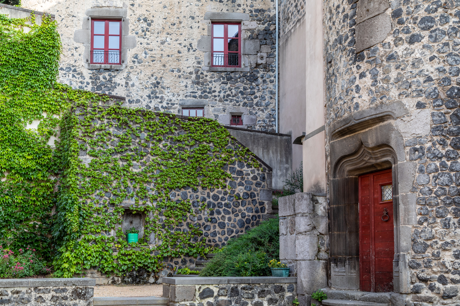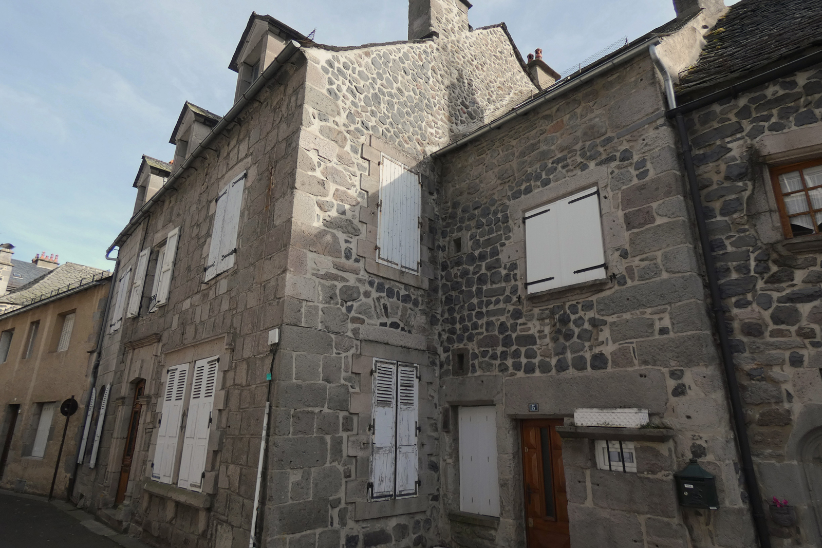 Maison style Renaissance dont l’appareillage taillé dans le trachyte a permis de créer cette façade riche d’ornements : bandeaux moulurés, échauguette en encorbellement, échauguette en saillie dans l’angle, pilastres avec chapiteaux toscans, fenêtres à meneaux, modillons à double volute. Portes à frontons triangulaires dont les tympans sont écussonnés.