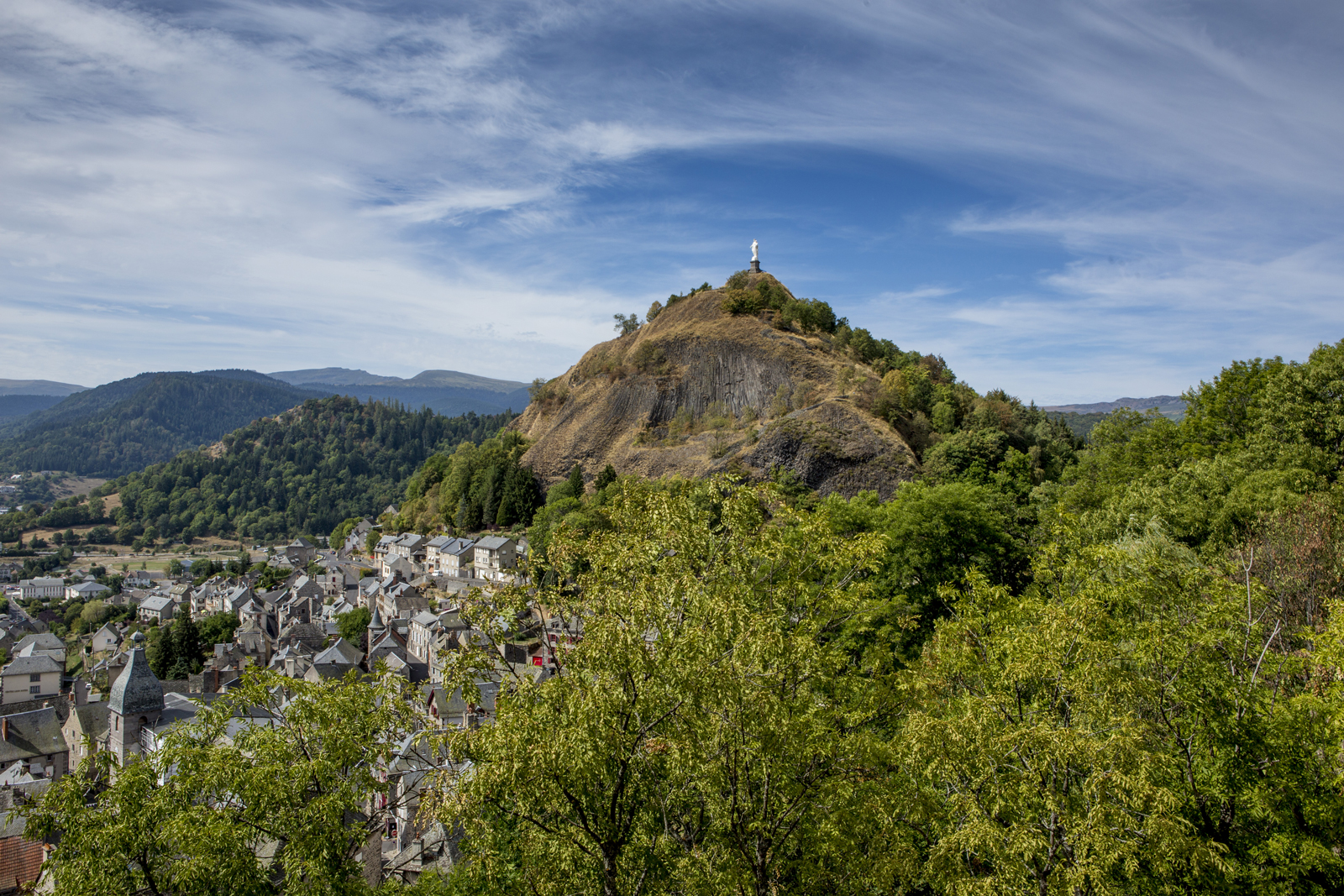Surplombant la vieille ville étagée en amphithéâtre, l’imposant rocher de Bonnevie possède des orgues basaltiques, parmi les plus fines d’Europe. La forteresse des Vicomtes de Murat, érigée en son sommet, fut détruite en 1633. Le 18 Juin 1878, fut dressée la statue en fonte de 8 mètres de haut et de 13 780 kg de Notre-Dame de la Consolation (actuelle Notre-Dame de Haute-Auvergne), représentation géante d’une vierge noire à l’enfant, prétendument ramenée de la 7ème Croisade par les compagnons de Saint-Louis et vénérée depuis lors.